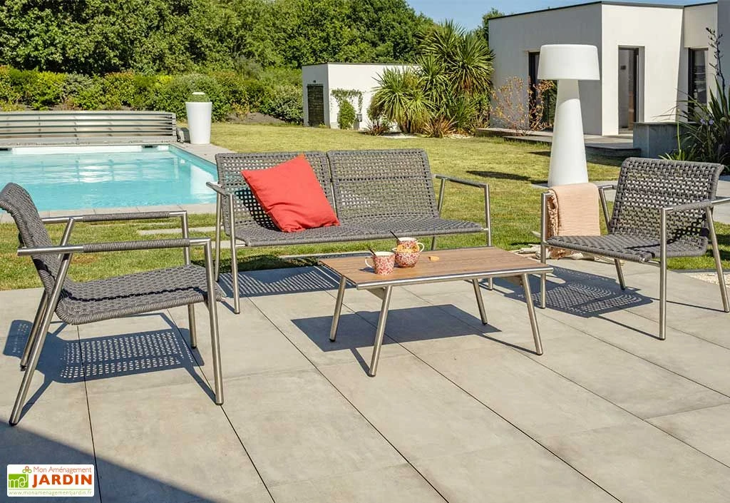 Robustes et confortables, le canapé et les chaises de jardin possèdent une structure en inox, un matériau idéal pour l’extérieur puisqu’insensible à la rouille, même sans traitement ou entretien. L’assise, le dossier et les accoudoirs de chaque élément sont quant à eux fabriqués en corde tressée et le tout est complété par des coussins gris clair déhoussables, pour plus de confort.
