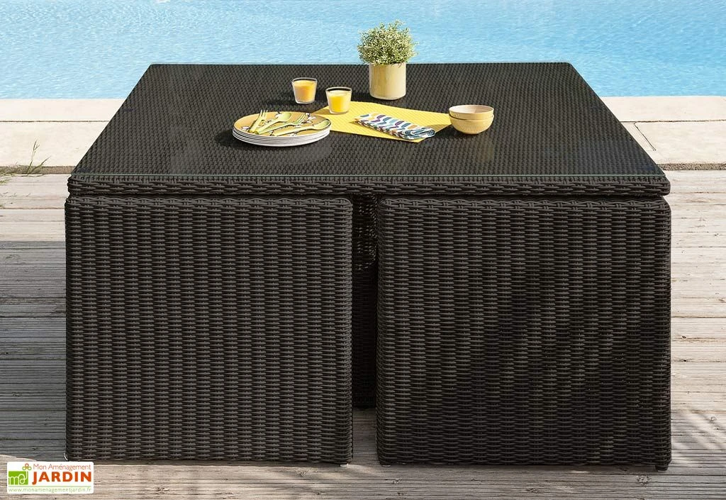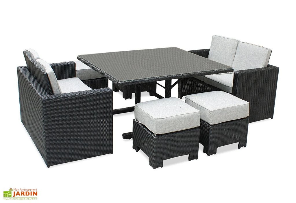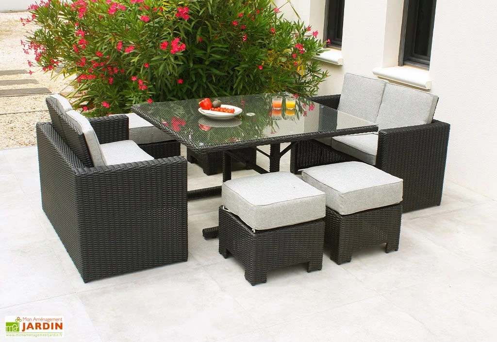 Le salon de jardin Océane de chez DCB Garden, ici en noir, se compose de deux canapé deux places, de quatre poufs et d’une table à manger, le tout encastrable afin de n’occuper que peu d’espace une fois rangé. Idéal pour profiter de votre extérieur en famille ou entre amis, cet ensemble repas pourra accueillir confortablement jusqu’à huit personnes. Un parasol pourra être intégré grâce au trou prévu à cet effet au centre de la table.