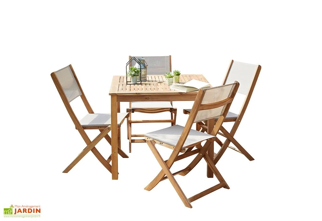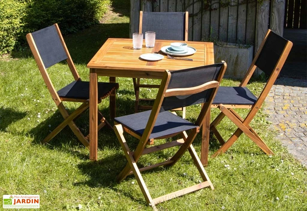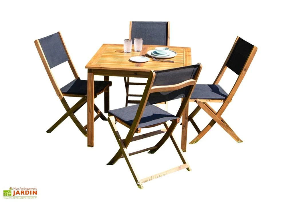 Le salon de jardin de la marque Wilsa est composé d’une table pour quatre personnes et de quatre chaises. L’ensemble est en bois d’acacia, un bois exotique qui apportera chaleur et originalité à votre jardin. L’assise et le dos des chaises sont fabriqués en textilène noir ou gris, un tissu qui résiste aux intempéries et aux rayons UV.
