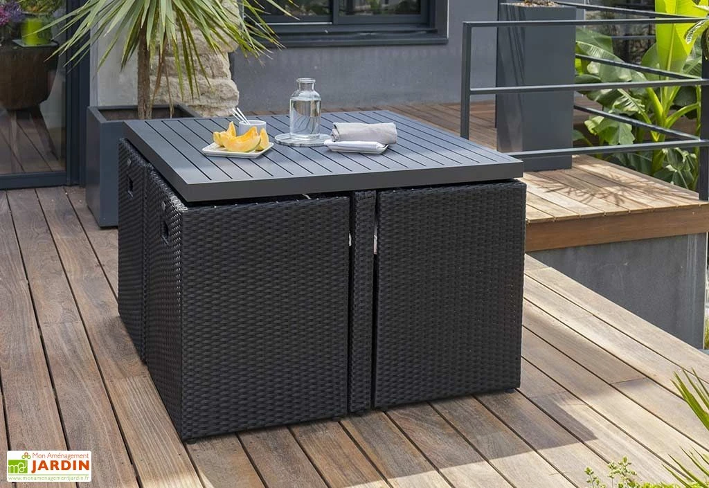 La table a une dimension de 105 x 105 x 74 cm (l,l,h). Les fauteuils mesurent 50 x 50 x 64 cm (l,l,h) et se rangent facilement sous la table. Le salon de jardin encastrable est livré en kit avec une notice de montage.