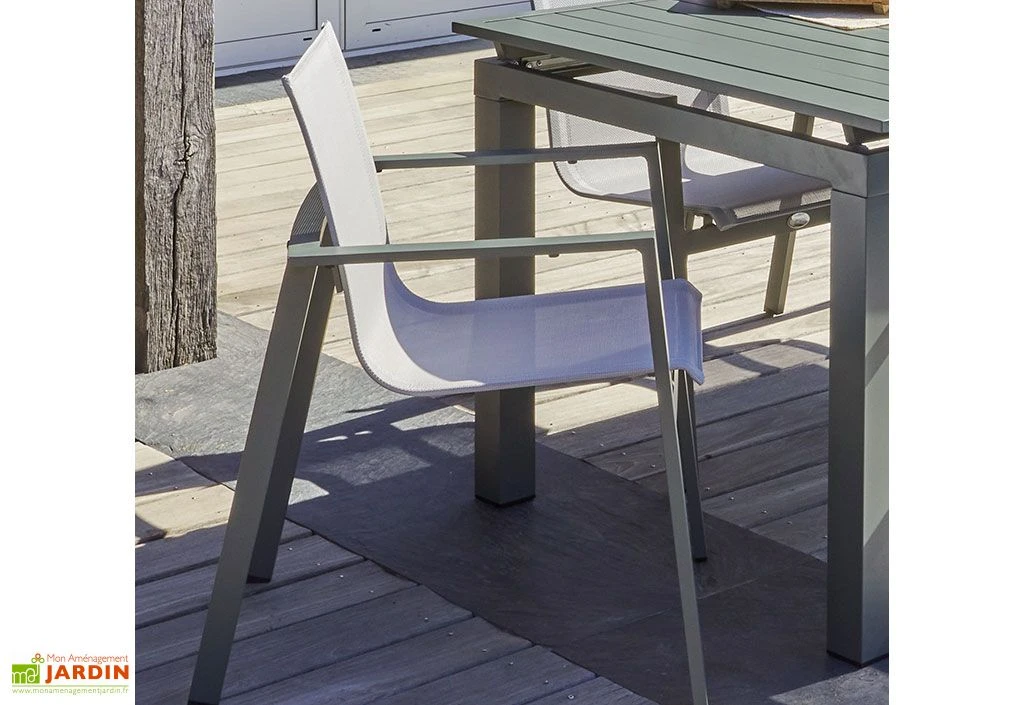 La table à manger qui compose ce salon de jardin est fabriquée en aluminium. Elle se montrera donc insensible à l’humidité et à la rouille sans pour autant exiger d’entretien particulier. Son plateau est constitué de lames en alu et grâce à sa rallonge automatique, cette table de jardin pourra aisément passer de 240 à 300 cm de long.