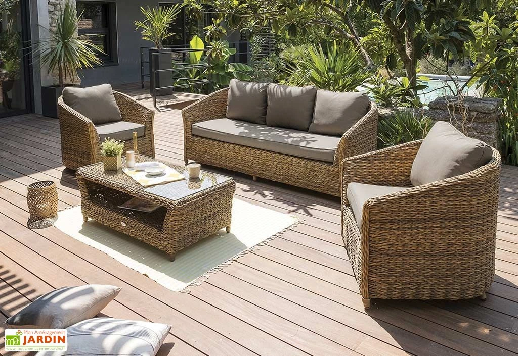 Le salon de jardin est livré déjà monté, vous n’avez plus qu’à l’installer. Il est livré avec ses coussins en polyester déperlant. L’intérieur des coussins est en mousse de 25kg/m3. Il est conseillé de rentrer les coussins lorsqu’il pleut. Le salon de jardin est garanti pendant 2 ans.