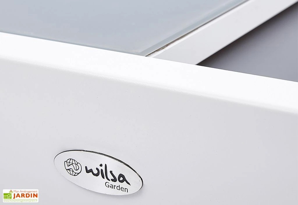 Votre salon de jardin Modulo de chez Wilsa comprend 9 éléments : une table extensible en aluminium avec un plateau en verre et une rallonge coulissante ainsi que 8 fauteuils assortis avec accoudoirs.