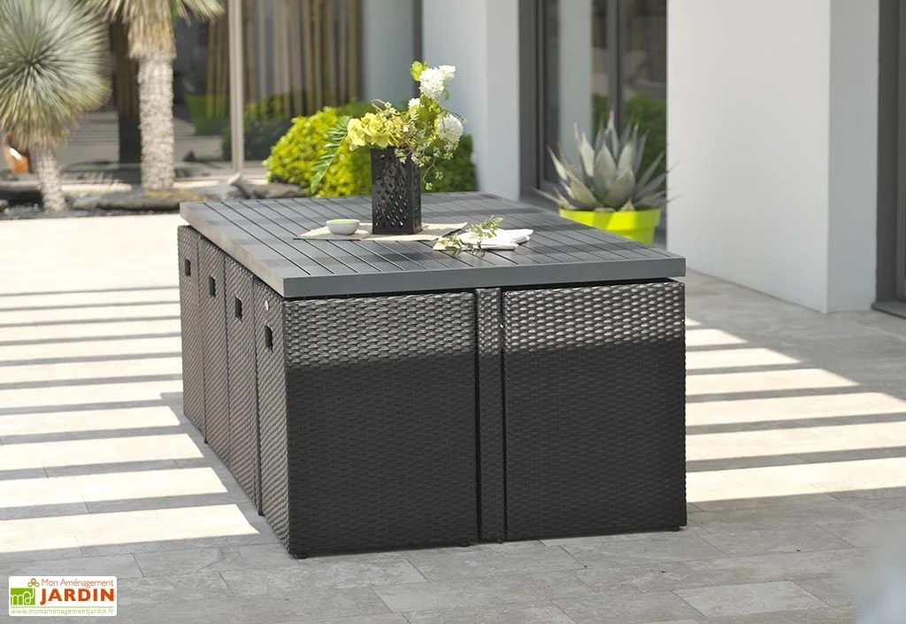Le salon de jardin DCB Garden peut accueillir jusqu’à 8 personnes grâce à sa grande table de jardin et à ses 8 fauteuils encastrables en aluminium. Il dispose d’un revêtement en résine tressée noire qui lui apporte modernité et originalité.