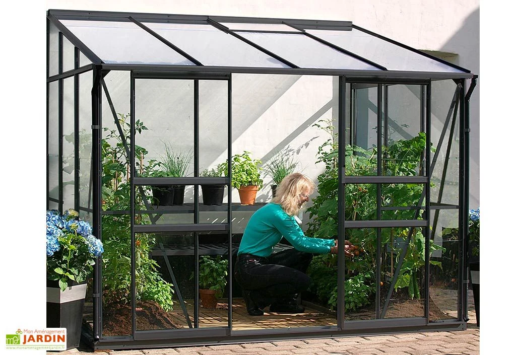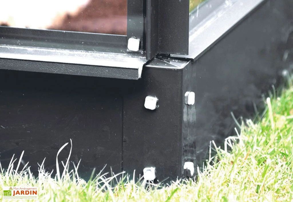 La serre adossée possède une structure en aluminium recouverte d’une laquage gris anthracite. L’aluminium est léger et les profils sont pré-percés pour faciliter le montage. Il résiste parfaitement à la corrosion et ne demande aucun entretien ni traitement. La visserie en inox est incluse. Elle est également insensible à la rouille.