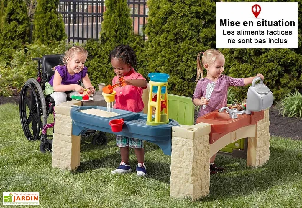 La cabane est livrée avec ses 16 accessoires, comprenant notamment des couverts et des assiettes. Un sac à mailles est inclus, permettant aux enfants de ranger tous leurs accessoires. Un couvercle est inclus pour garder le sable propre et sec. Des portes battantes permettent de pénétrer sous l’auvent.