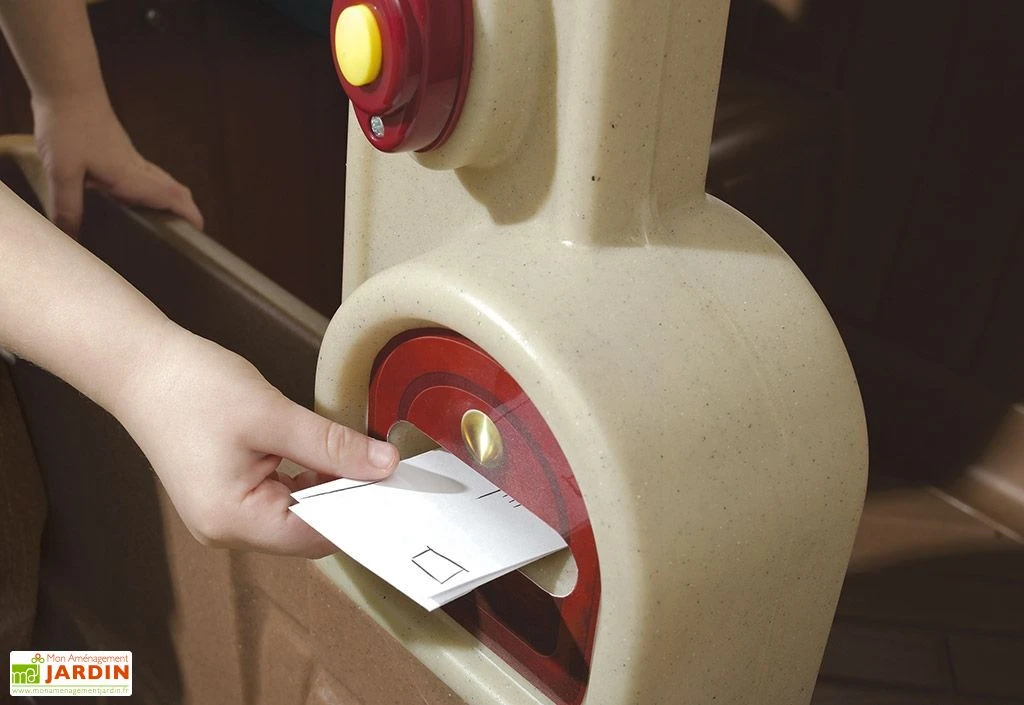 A l’extĂ©rieur de la cabane, les enfants peuvent trouver un pot de fleurs intĂ©grĂ© dans la paroi (fleurs non incluses), une boite aux lettres et une sonnette qui fonctionne vraiment (avec 2 piles LR03 non incluses).Â