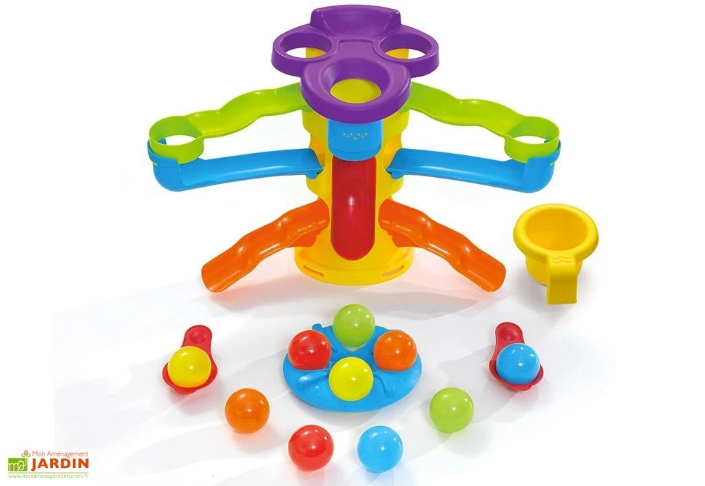 La table de jeux d’eau dispose d’un carrousel, de 2 catapultes et de 3 chemins différents pour faire tomber les boules. Elle dispose d’un bouchon de vidange pour une utilisation facile. Elle peut contenir jusqu’à 15 litres d’eau.