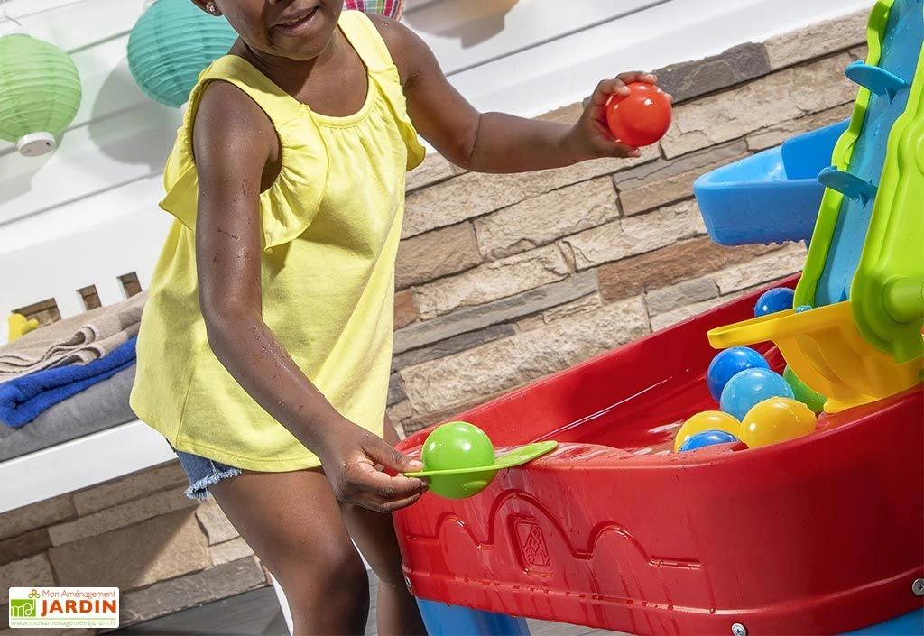 La table de jeux d’eau Discovery Ball de chez Step 2 est livrée avec ses 10 balles en plastique coloré. Elle est originale et amusante puisqu’elle permet aux enfants, à partir de 2 ans, de faire glisser les balles sur des rampes, de les lancer avec des leviers et catapultes, de les faire passer dans un entonnoir et de les laisser retomber dans l’eau.