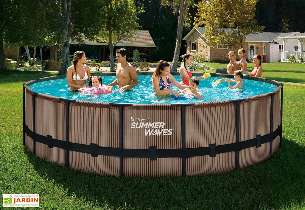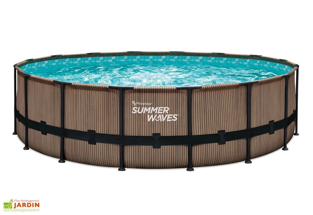La piscine tubulaire SUMMER WAVES promet un espace pour toute la famille avec un diamètre de 4,88 m pour 1,22 m de haut. La structure de cette piscine autoportée est faite d’acier de couleur noire, garantissant la stabilité et la sécurité du bassin. Ce dernier est composé de PVC triple épaisseur, résistant aux rayons UV et aux produits de traitement de l’eau tel que le chlore. À l’extérieur, le PVC revêt un aspect design effet teck. Dans le bassin, un motif nid d’abeille de tons bleus met en valeur votre eau.
