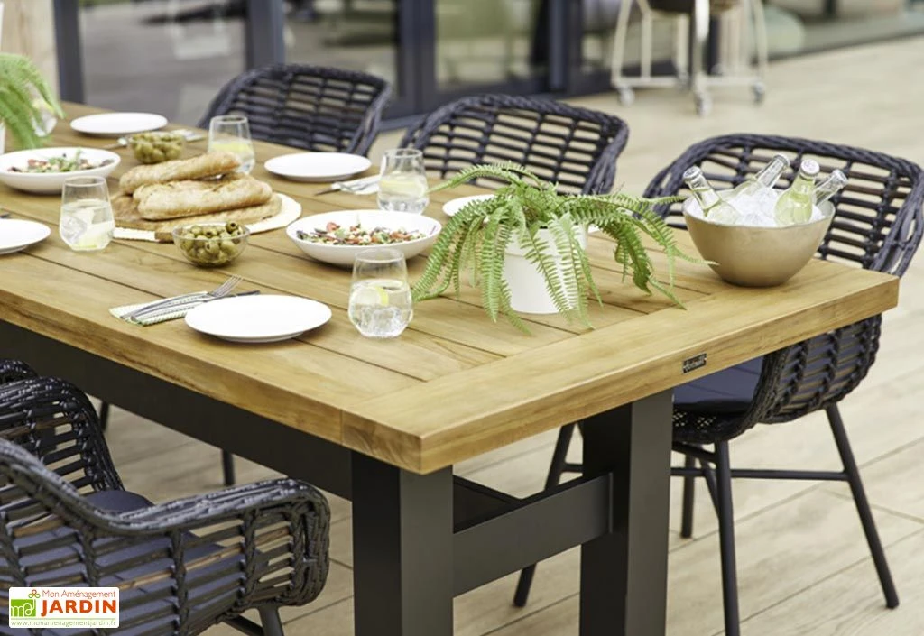 La table de jardin rectangulaire Sophie Yasmani Teak de la marque Hartman est dotée d’un plateau en teck, un bois imputrescible et donc naturellement résistant à l’humidité et aux champignons qui pourraient le détériorer. Ce plateau mesure 240 cm de long sur 100 cm de large, ce qui permet à cette table d’accueillir six à huit personnes.