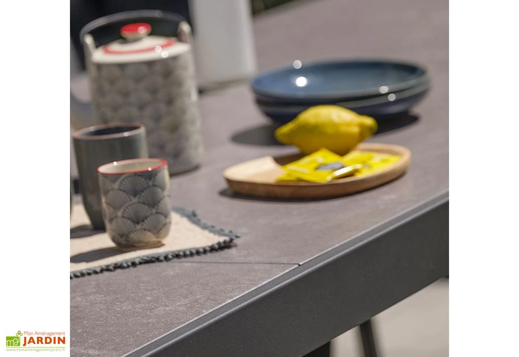 La table de jardin Stockholm de chez DCB Garden est conçue pour accueillir jusqu’à douze personnes. Son plateau de 96 cm de large intègre en effet une rallonge lui permettant de passer de 2 à 3 m de long en un clin d’œil. Ce plateau, fabriqué en céramique sur verre, est inrayable et facile à nettoyer. Il repose sur une structure en aluminium couleur gris anthracite.