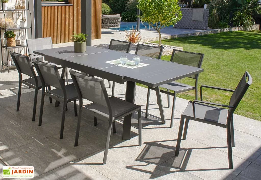 La table de jardin Stockholm de la marque DCB Garden est équipée d’un plateau extensible pouvant passer de 150 à 225 cm de long (rallonge intégrée), ce qui lui permettra d’accueillir jusqu’à huit personnes. Ce plateau de 96 cm de large est conçu en aluminium, tout comme la structure de la table, et revêt une finition anthracite aussi à la fois sobre et moderne.