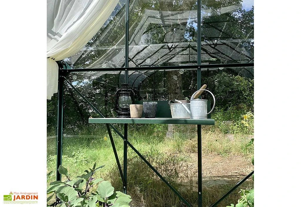 La table de rempotage se fixe simplement sur les profilés de la serre de jardin en aluminium à la hauteur de votre choix. Deux jambes de force sont incluses pour assurer la stabilité de l’ensemble. Toute la visserie est en inox pour une table entièrement protégée contre la rouille.