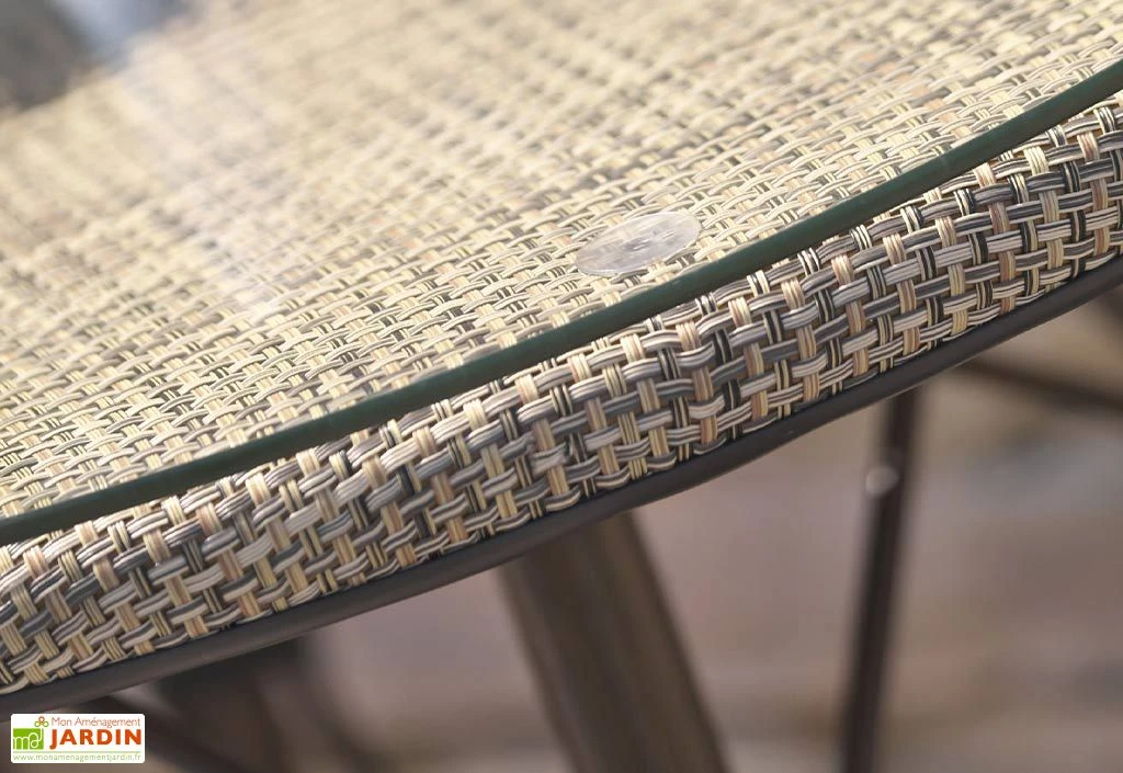 La table de jardin Ushuaia se compose d’une structure en aluminium avec un plateau en textilène et verre de 125 cm de diamètre. Elle a une hauteur de 74cm. Cette table, inoxydable et légère, résiste au soleil, aux moisissures et à l’humidité. Ces propriétés en font un élément idéal pour votre jardin.