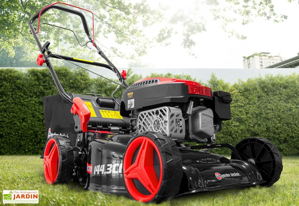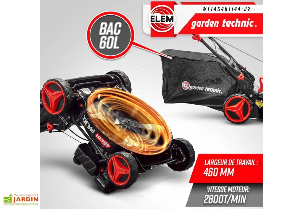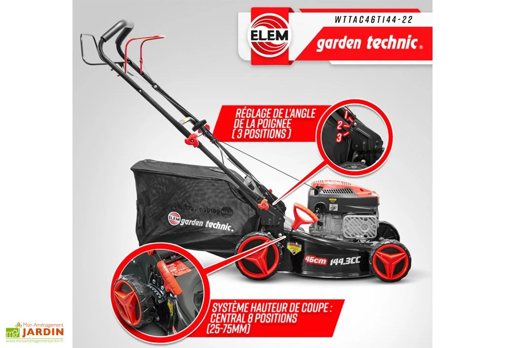 Cette tondeuse thermique de chez Elem Garden est équipée d’un moteur à essence (95 ou 98 oct.) de 144,3 CC (2,5 kW). Il s’agit d’un modèle offrant une largeur de coupe de 46 cm et doté d’un système de coupe centralisé réglable en hauteur selon huit positions, entre 25 et 75 mm.