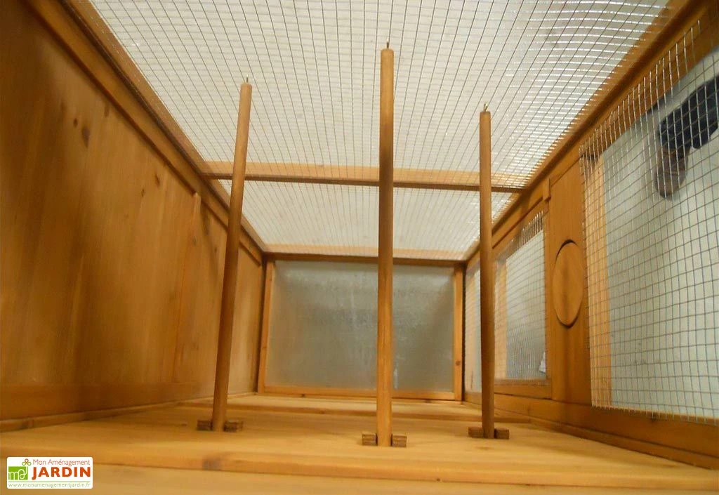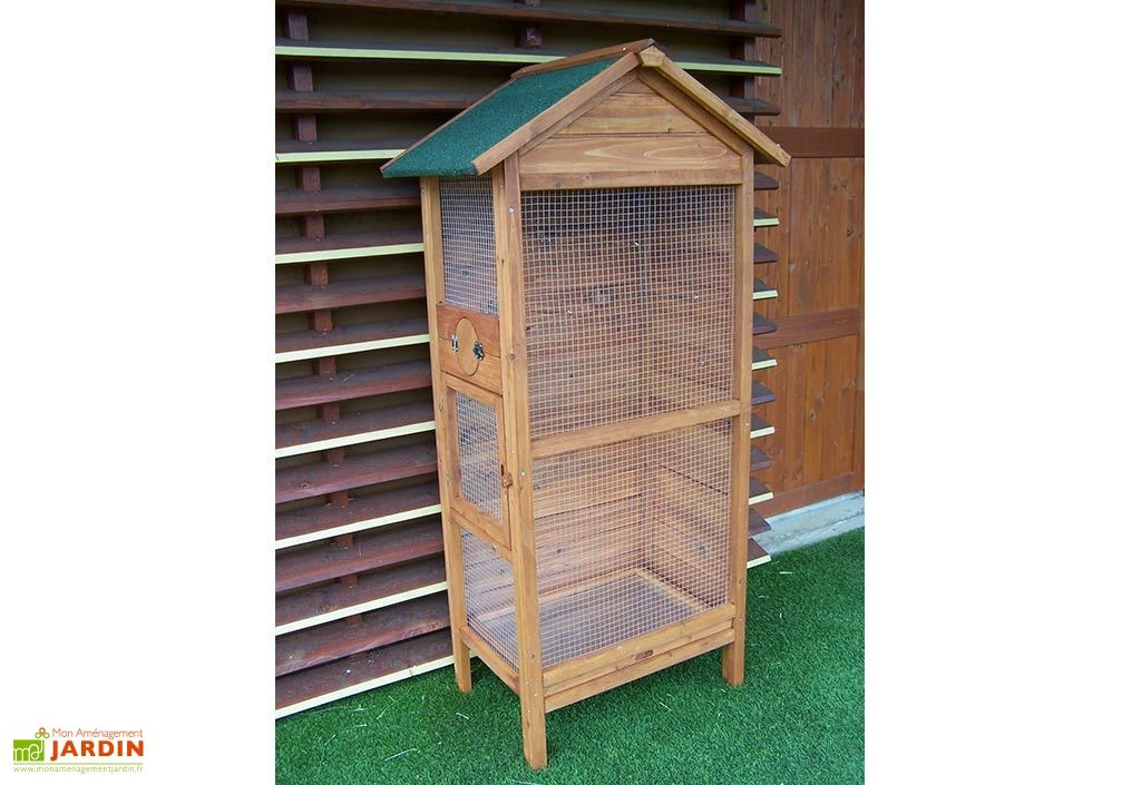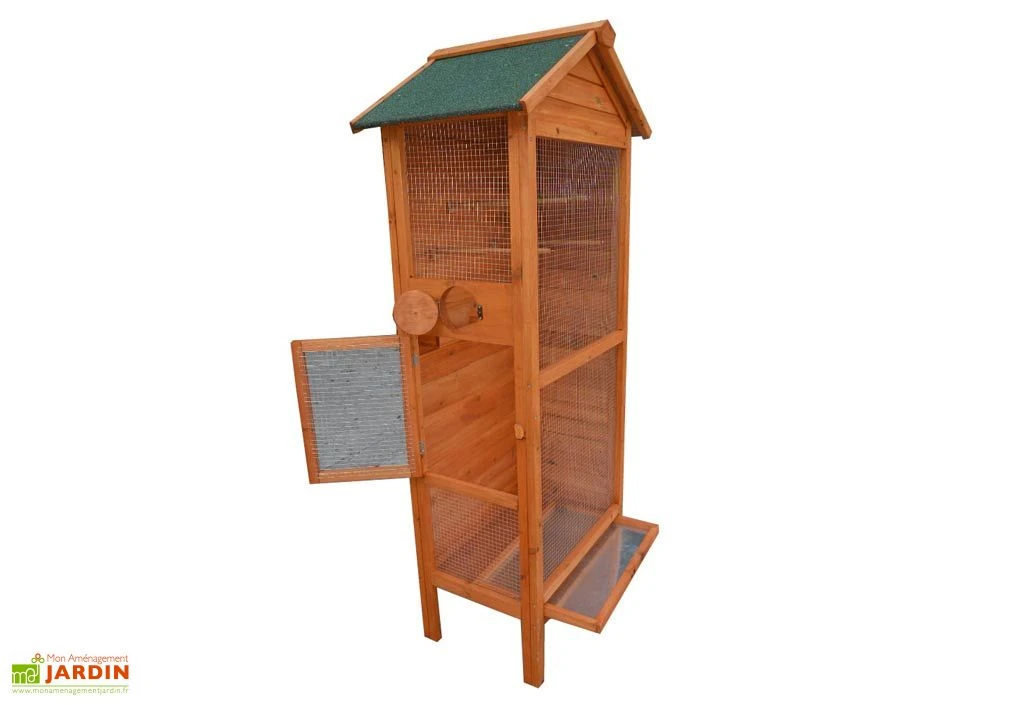 La volière à oiseaux rectangulaire de chez Habrita dispose d’une porte d’accès. Elle est bois FSC de 10 mm d’épaisseur. Ses dimensions au sol sont : 63 x 41 cm (l,l) et hors tout : 77,5 x 54,5 x 158 cm (l,l,h). La cage à oiseaux est livrée avec un toit bitumé bi-pente vert et deux murs pleins pour la protection des oiseaux. Le grillage galvanisé possède un maillage de 1 x 1 cm. La cage est en bois clair et dispose d’un tiroir à déjection de 57 x 35 x 3 cm (l,l,h) et de 3 perchoirs. Elle est garantie 2 ans.